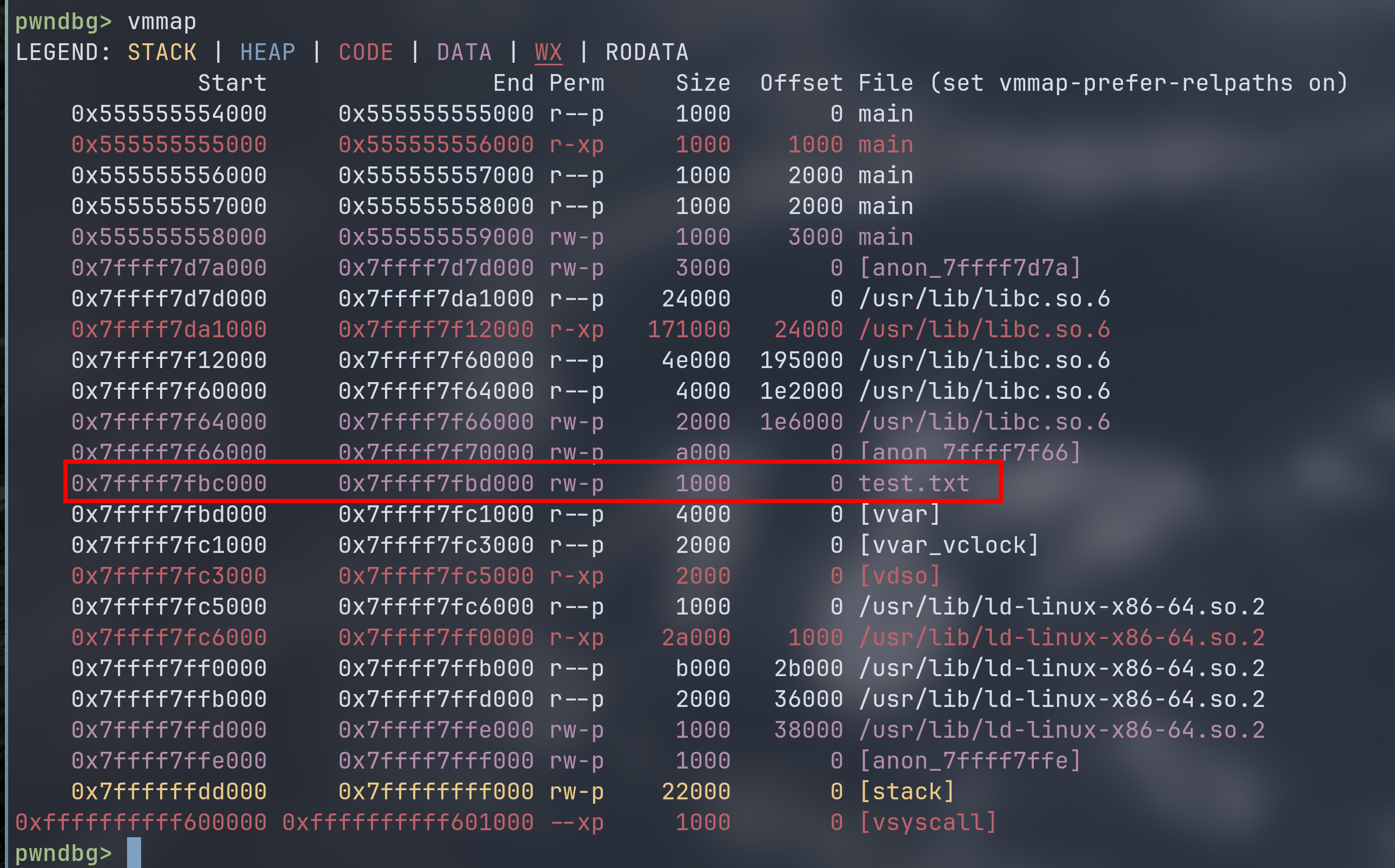 通过 pwndbg 的 vmmap 可以较为清楚的看到在 0x7ffff7fbc000 ~ 0x7ffff7fbd000 这段 1024 字节的区域被划分给了 test.txt 使用。权限为 rw-p 。