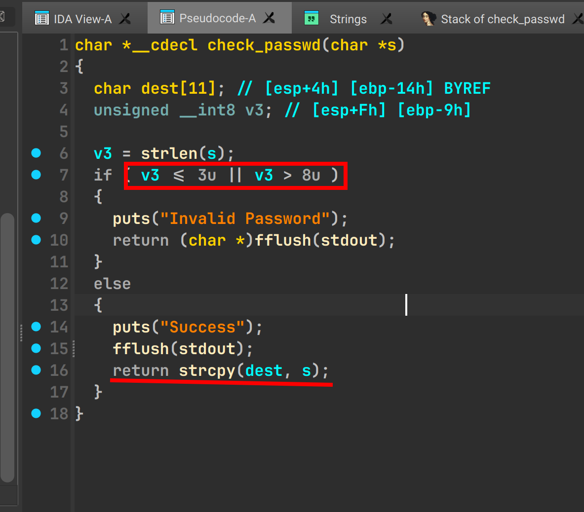 但是我们回到 check_passwd 函数,如果要跳到 strcpy 函数中,就需要 v3 为 [3, 8),可是我们要溢出攻击可不够,此时回到最开始的,我们可以借助无符号数回绕来帮助我们。