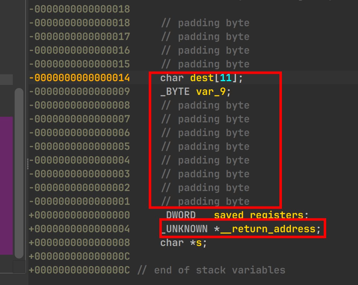 注意 v3 是 unsigned __int8 类型,只有一字节大小,可以表示的范围为 0~255! 而 dest 更小了,才 11 字节,相比较形参 s 是可以有 512 字节的,显然可以进行栈溢出操作。