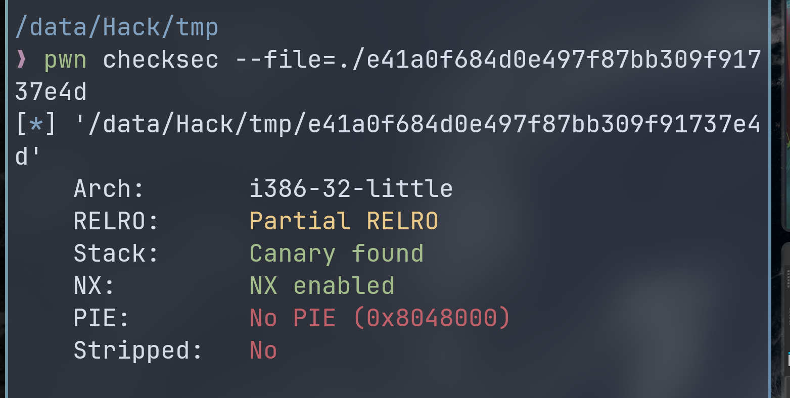 32 位 elf 文件。有金丝雀保护,不过我现在还不知道 canary 到底怎么保护栈溢出。反正本题也不需要。