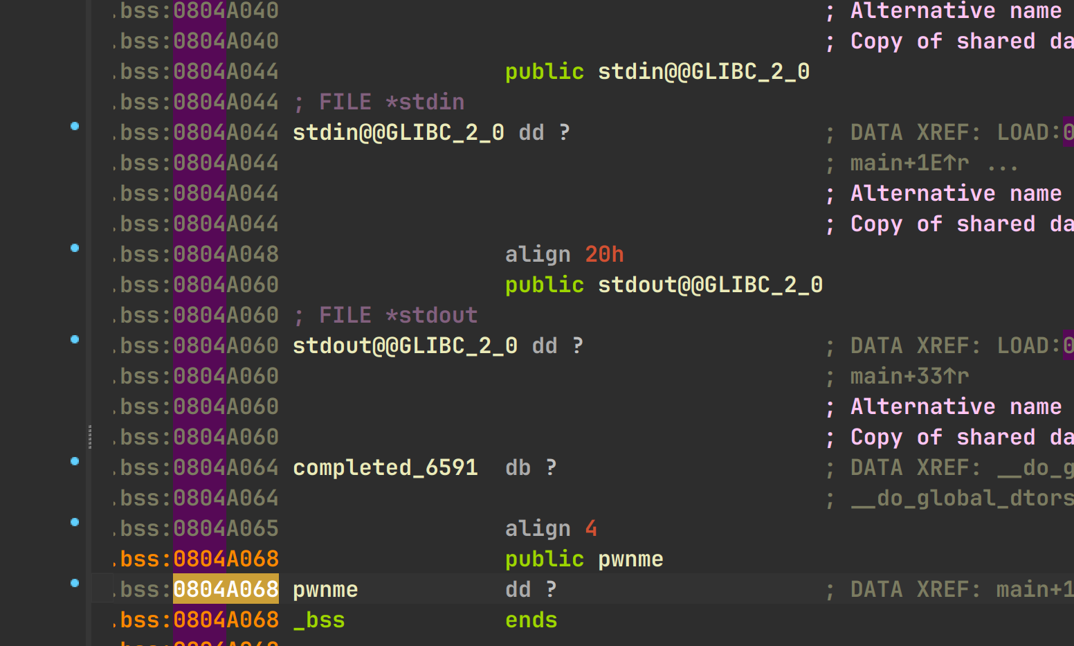在这里我们可以看到 pwnme 位于 .bss 字段,也获得了它的地址。现在就是要寻找到改写这个地址数据的方法了。