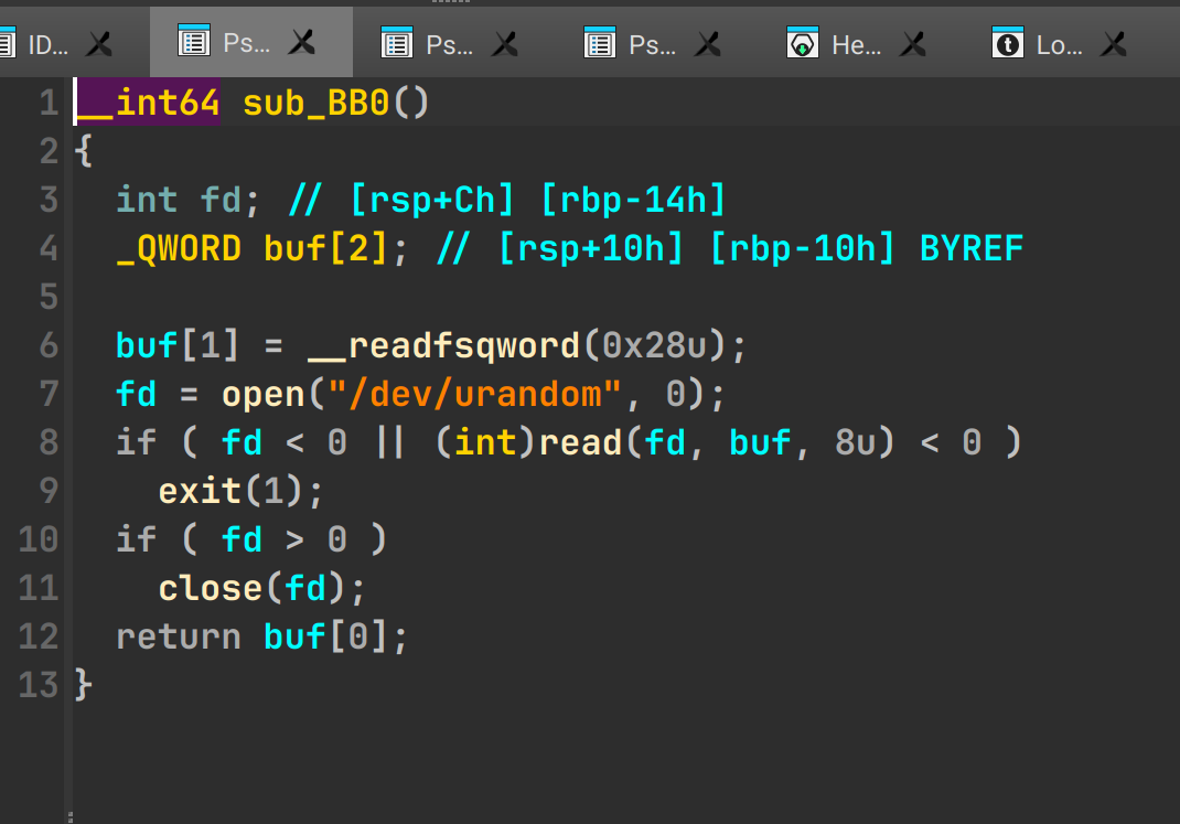对此,我们需要得到种子,这里 seed[0] 存储种子,但是又发现种子是靠 sub_BB0() 函数获得的,而 sub_BB0() 靠 /dev/urandom 获得随机数,基本上就是说种子是随机的,那么随机数也大抵是很随机的……