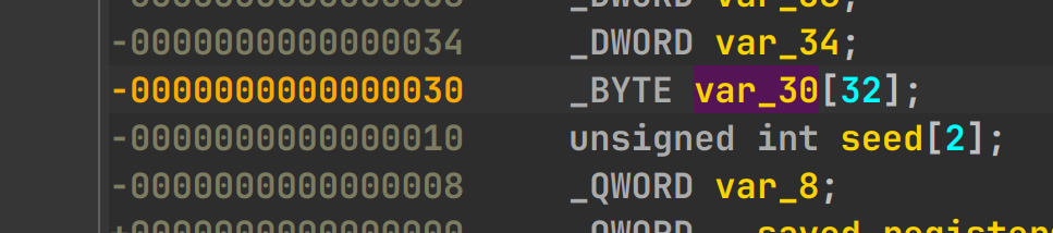 v7(var_30) 往下就是 seed 的空间,它们之间只差了 0x20 字节。显然我们可以通过 gets() 的漏洞改写 seed 内的数据。