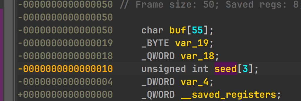 buf 和 seed 之间差了 0x40 ,也就是 64 字节。实际就是 55 + 9,这里 9 是 var19 和 var_18 ,看 main 好像另有用处,但是我尝试了下直接覆盖掉也没关系?