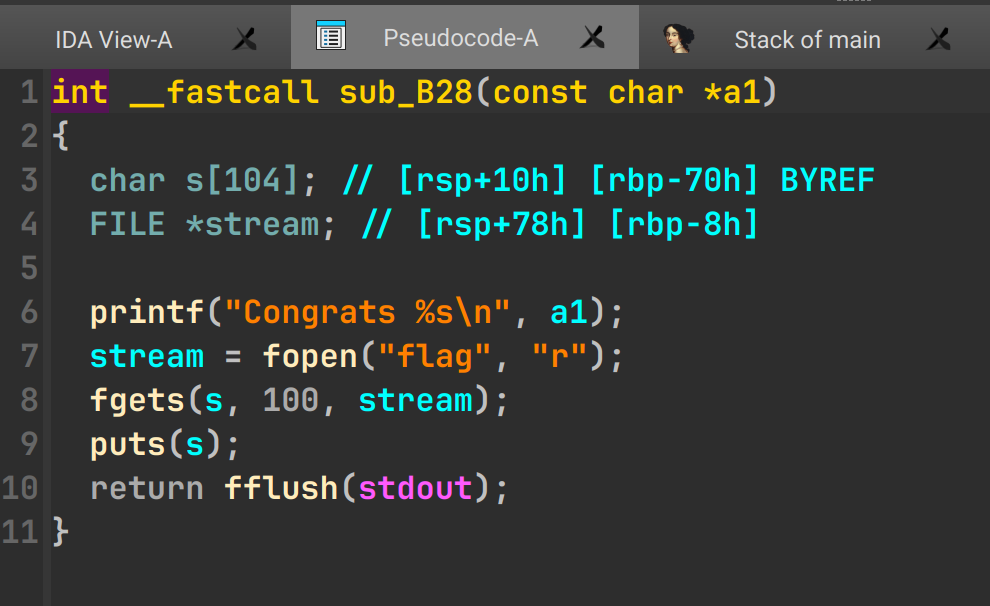 再看看猜数字的过程,当 50 次满后进入 sub_B28 函数,该函数直接读了 flag 文件。