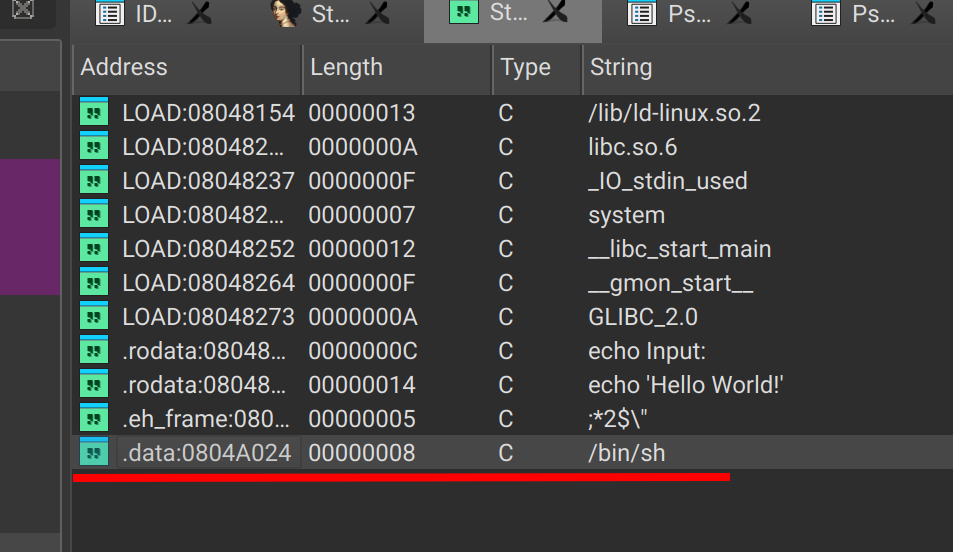 在 ida pro 中按 shift + F12 查看字符串,发现在 .data 段居然有 shell 路径!