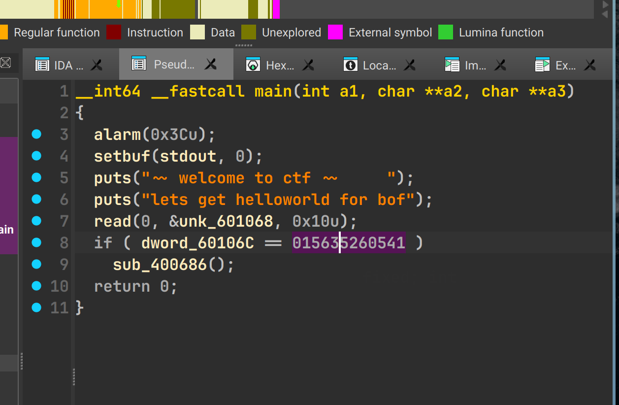 main 函数如下,很简单,标准输出 Hello World\n 就进入 vulnerable_function 函数