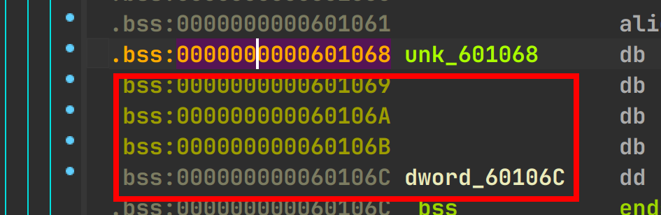 分析 main 发现,read 函数输入了 16 (0x10)字节数据,但是 unk_601068 和 dword_60106C 之间只差了 4 个字节!!!
