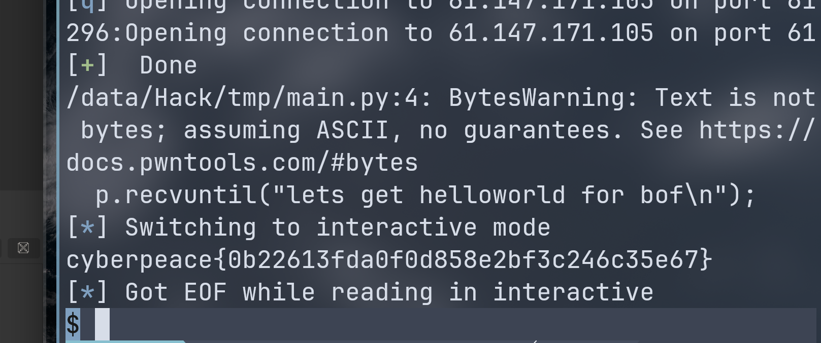 recvuntil() 函数等待到前面 Hello, World 读了之后再填入载荷。