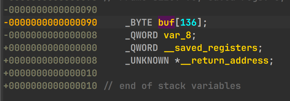 通过 ida pro 的栈可知栈顶为 0x90 则 0x90 - 0x8 就是 canary 所在处。除 8 得 17 ,加上偏移量得出获得 canary 需要偏移 23 位。