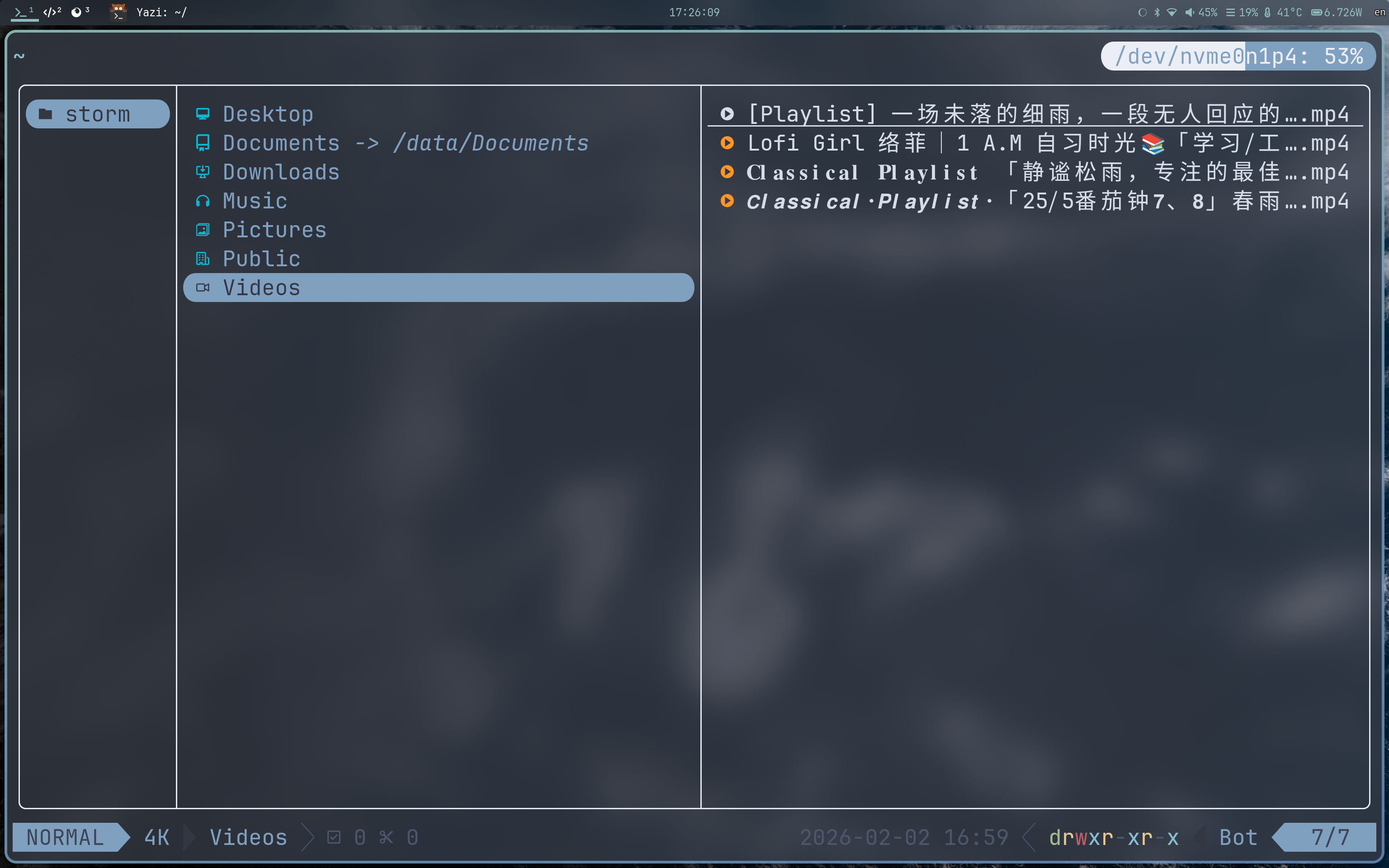 底部的状态栏是 llanosrocas/yaziline.yazi。 从左到右分别是 yazi 模式、选中文件大小、选中文件名称、选择剪贴数量 和 文件修改日期、文件权限、位置。